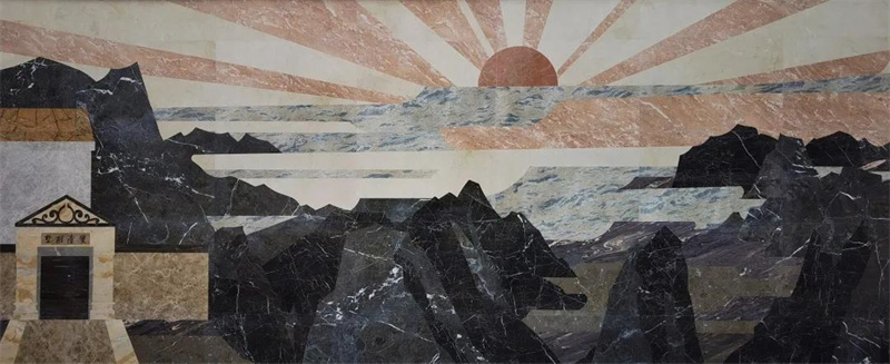 北京香山路上的石材鑲嵌壁畫《三山五園攬勝圖》局部,描繪了香山革命舊址雙清別墅,作者孫韜。