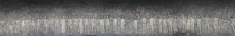 用壁畫美化建筑空間,不僅美在裝飾,還美在以藝術語言拓寬空間景深。為呈現更好的視覺效果,創作者依據不同的空間需要,創新藝術表達。在今年開館的中共一大紀念館,前廳三幅壁畫《日出東方》《民族脊梁》《中流砥柱》分置于不同墻面上,相互呼應,協調統一,壯闊瑰麗如浮雕般的瓷板畫,既豐富了建筑空間層次,又為觀眾帶來視覺與精神的雙重震撼。