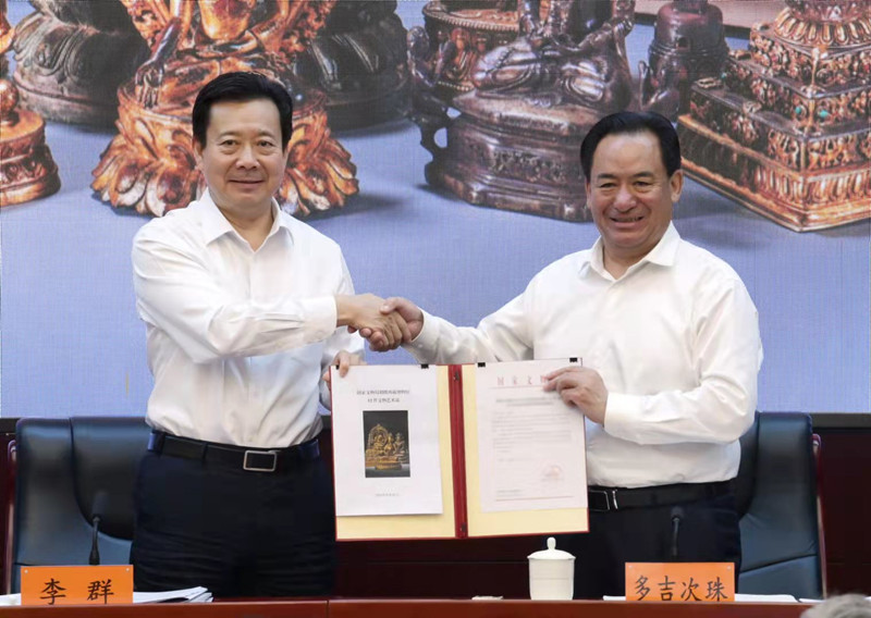 文化和旅游部副部長、國家文物局局長李群與西藏自治區人民政府副主席多吉次珠交接文物劃撥清冊,將從美國成功追索回國的12件文物藝術品整體劃撥西藏博物館。(攝影:新華社記者李賀)