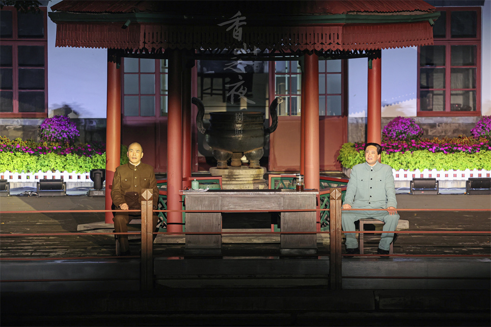《香山之夜》是由中共北京市委宣傳部、北京市文化和旅游局、北京人民藝術劇院聯合推出的慶祝中國共產黨成立100周年重點劇目。該劇以1949年4月23日晚解放軍強渡長江,占領南京這一重要的歷史關頭為時間節點,通過毛澤東、蔣介石二人的“超時空心靈對話”,為觀眾們展示了一幅更為宏觀的歷史史詩畫卷。劇中兩位角色的身份在“演員”與“歷史人物”間反復跳進跳出,通過對史實的全方位呈現與充滿思辨和張力的對話,輔以毛澤東詩詞的詩意展示,以戲劇性的手法對中國共產黨走向新民主主義革命勝利的艱辛歷程進行了回顧,讓這部作品達到了藝術性和思想性的高度統一。
