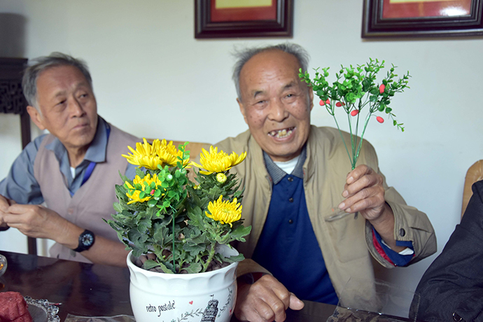 社區老人在展示制作的茱萸花卉。IC資料圖