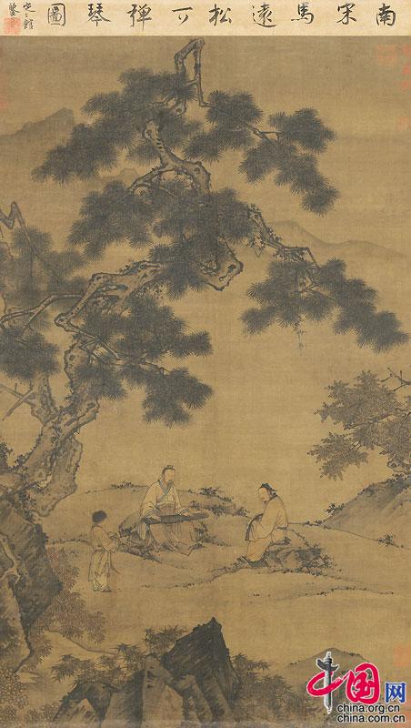 《松下彈琴圖》為典型的馬遠畫風,繪有山石、勁松、高士,或為“伯牙鼓琴”之典故。單國霖指出,《松下彈琴圖》被謝稚柳先生標為馬遠的作品,是南宋畫無疑。此作用筆堅實剛健,以干脆利索的斧劈皴刻畫石頭,人物的畫法也屬南宋風格,與美國納爾遜-阿特金斯藝術博物館藏南宋馬遠《西園雅集圖卷》十分接近。