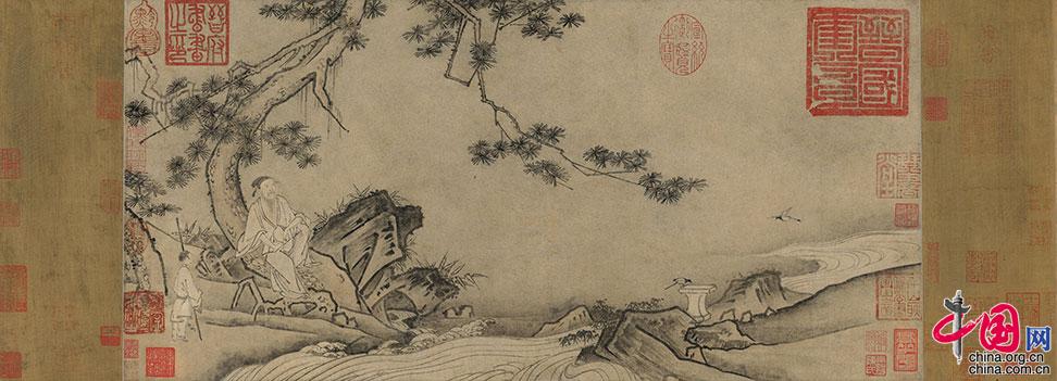 另一幅馬遠《松泉高士圖》為紙本手卷,水墨紙本?!端扇呤繄D》中畫面左側有一高士坐于松石之上,身后一侍童執杖而立,周圍松樹林立,流水潺潺;畫幅右方留白,給人以無限遐想。