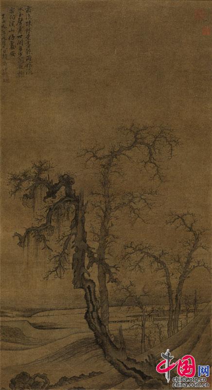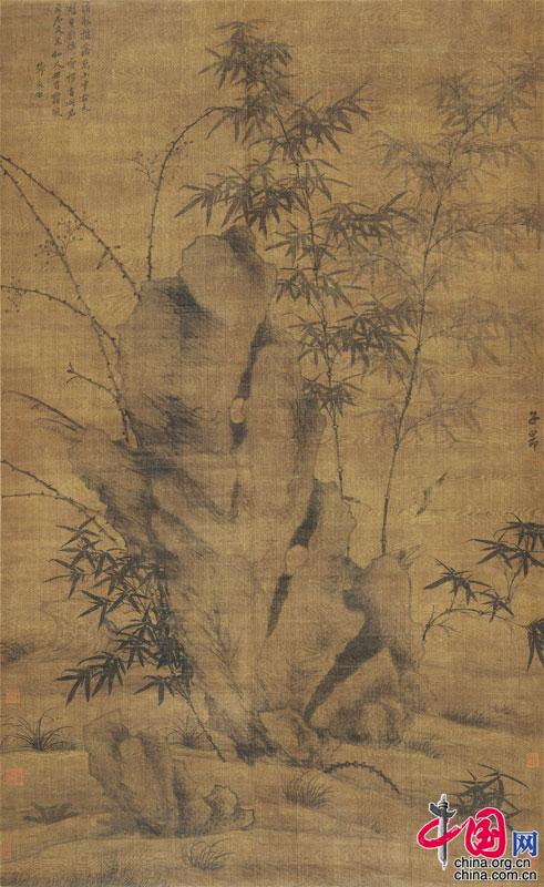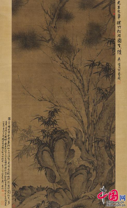 王冕(傳)《梅竹松石圖》,立軸,水墨絹本,171.7×86cm。謝稚柳先生認為此作是王冕傳世的唯一松竹湖石題材:“傳世之作無非橫斜疏影,惟此松竹湖石為世所僅見?!?/p>