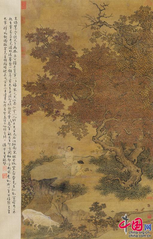 宋畫中對于兒童的描繪應為歷代中最為豐富者,出現了諸多擅畫兒童的畫家,兒童畫這種題材趨向專門化,甚至出現了長于畫某種題材的專門畫家?!肚锪帜镣瘓D》繪兩小兒于田野間坡石處嬉戲玩耍的場景,畫面右下部兩只正覓食于田間的山羊增添了田園幽靜的氣氛。