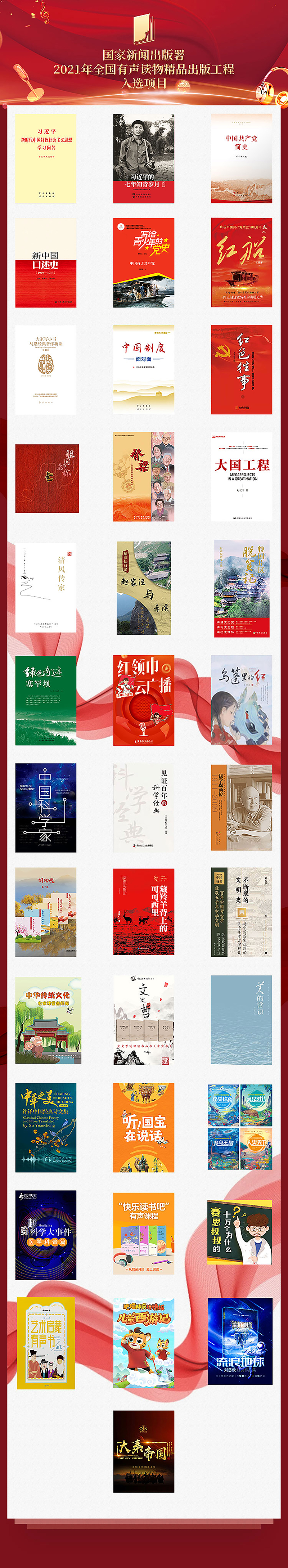 據介紹,今年作品評選更加注重有聲讀物的思想價值、學術價值、文化價值和藝術價值。有的作品立體呈現、生動宣傳習近平新時代中國特色社會主義思想,如《習近平新時代中國特色社會主義思想學習問答(有聲版)》《習近平的七年知青歲月(有聲版)》;有的作品圍繞中國共產黨成立100周年主題,講述中國共產黨百年光輝歷程和偉大業績,如《中國共產黨簡史(有聲版)》《新中國口述史(1949-1978)(有聲版)》;有的作品聚焦全面建成小康社會取得的偉大歷史性成就、脫貧攻堅戰的全面勝利,展現人民群眾奮進新時代、開啟新征程的信心面貌,如《大國工程(有聲版)》《精準扶貧路:趙家洼與赤溪》《脊梁——共和國勛章獲得者的故事》;有的作品堅定文化自信,傳承和發揚中華優秀傳統文化,如《不斷裂的文明史:對中國國家認同的五千年考古學解讀(有聲讀物)》《中華傳統文化名家課堂音頻庫》;還有的作品著眼提高人民群眾文化素養和科學素質,傳播普及科學文化知識,如《中國科學家》《見證百年的科學經典(有聲讀物)》等。