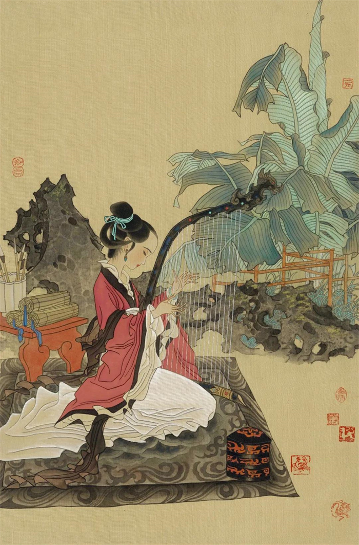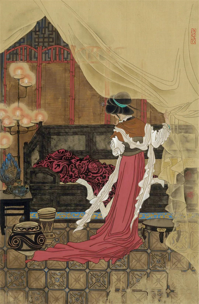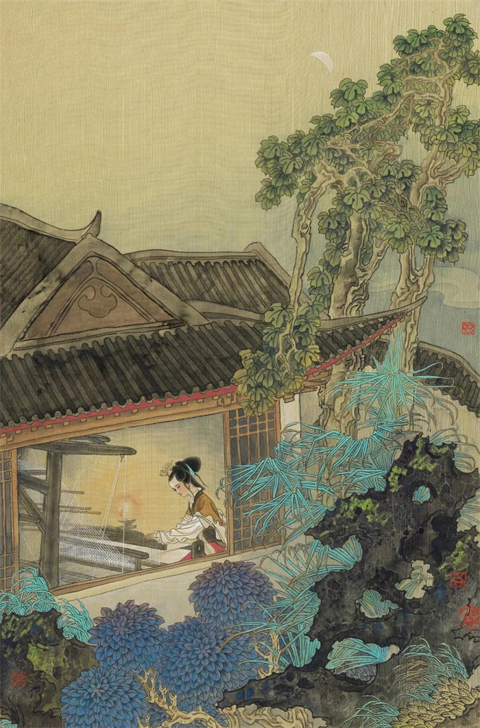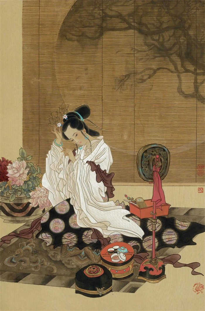 蕭玉田先生以“詩意畫”飲譽畫壇。他不但精擅工筆藝術語言,而且諳熟古典詩詞并深刻感悟其意境,漢樂府、唐詩、宋詞、元曲中的名篇成為他想象與寄情的源泉,以精湛的工筆技藝將相對抽象的詩意、詞情、曲境,轉換為工筆畫的形、色、空間,升華為饒有詩意的視覺形象,通過藝術的語言與手法對古典詩詞意境進行再闡釋。在其筆下,詩情與畫意穿越時空而匯聚為一種亦古亦今的新意象??梢哉f,他的詩意畫是當代藝術家浸染了古典文化精髓的再創造,用當代審美為古典詩詞賦予新的想象空間。
