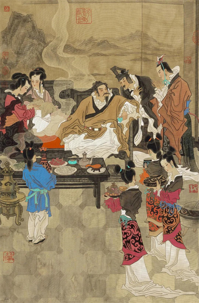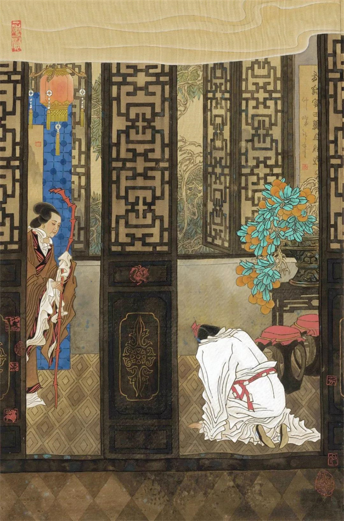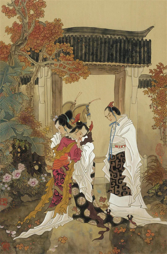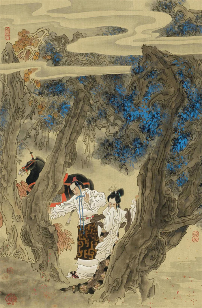 本次展覽展出的工筆重彩連環畫《孔雀東南飛》取材于漢樂府詩《孔雀東南飛》。蕭玉田先生舉重若輕地把這一千古絕唱熔鑄成回腸蕩氣、凄美動人的連環圖畫,衍化成賞心悅目的視覺畫面。他的作品造型和用筆顯然由陳老蓮和“海上三任”而來,線條遒勁如屈鐵盤絲,且圓潤方折,疏朗大方,緊勁連綿,意興疏闊;色彩表現則源自他進入到古代情境中生成的心象色彩。作品美而不媚,細而不膩,疏密有節,注重意境,力求古意,展示了作者多年淬煉的深厚功力。這套連環畫作品入選第七屆全國美展,并榮獲第四屆全國連環畫評獎繪畫三等獎。