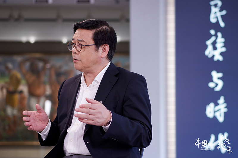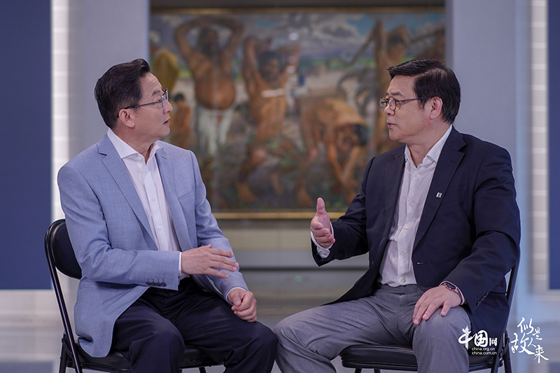 中國網總編輯王曉輝(右)對話中國美術家協會副主席徐里(左)。中國網記者 胡俊 攝