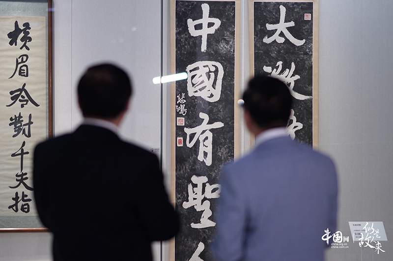 王曉輝、徐里賞析徐悲鴻書法作品。中國網記者 胡俊 攝