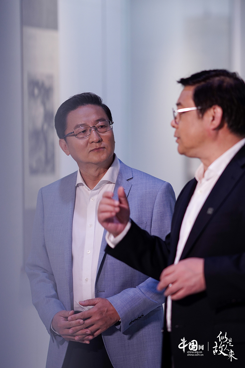 王曉輝、徐里在徐悲鴻著名畫作《愚公移山》前交流。中國網記者 胡俊 攝