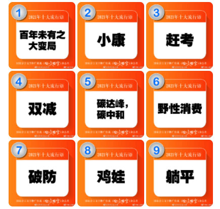 因此,我們堅持把結構、含義、用法上是否有“創新”作為評選流行語的重要標準。如去年的“人民至上,生命至上”“直播帶貨”“雙循環”“凡爾賽文學”等,今年的“百年未有之大變局”“雙減”“碳達峰,碳中和”等,都是漢語中的新結構;去年的“逆行者”“颯”“后浪”“神獸”等,今年的“小康”“趕考”等,流行的都是新的含義;去年的“打工人”“內卷”等,今年的“破防”“躺平”等,在用法上都有所創新。