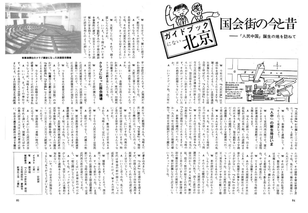 1993年《人民中國》創刊40周年,因為工作需要延長離休年限的老安在也即將迎來光榮離休的時刻。當時我正在負責“導游手冊上找不到的北京景點”欄目的策劃與采編。我突發奇想,提出要做一期《人民中國》發祥地內容的特別報道。老安聽說后非常支持這個想法,因為參與創辦的人當中,當時只有她還在崗位上。也許是在結束職業生涯之際想重訪自己當年起步的地點,也許是為了對年輕人做一次傳統教育,老安決定帶我一起前去位于新華通訊社內的國會街采訪。到了國會街,當年的建筑已經蕩然無存。老安感慨萬千,回憶起當年創業時激情燃燒的歲月。最后,我們以兩人對談的方式完成了這篇文章。日文成稿后請老安閱示,返回的底稿留下了老安用紅筆認真修改的痕跡。老安卻非常謙虛地堅持把她的名字署后面。這份修改稿我一直保存著,直到《人民中國》幾次搬家之后遍尋無蹤,至今仍感遺憾。