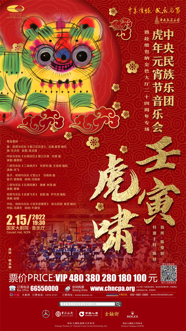 2月15日,在2022年虎年春節的尾聲,中央民族樂團以一臺特別策劃的“壬寅虎嘯”元宵節音樂會,將重現一份24年前的音樂記憶。音樂會上半場精選1998年演出曲目,下半場趙聰、馮滿天等眾多民樂名家帶來展現民樂創新力的當代力作。新民樂、老經典相結合,名家云集,是全年“中華情懷·民樂名家”在元宵佳節之際的開幕重磅呈獻。