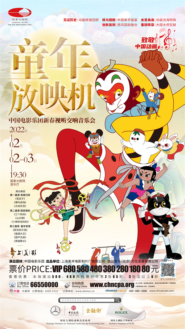 2月2日至3日,指揮家王永吉將執棒中國電影樂團,和美猴王、葫蘆娃、黑貓警長、哪吒等陪伴一代代人成長的經典熒幕卡通形象相聚“童年放映機——中國電影樂團新春視聽交響音樂會”,與您在耳熟能詳的動畫音樂中重溫童年回憶。本場視聽交響音樂會取得了上海美術電影制片廠正版授權,在“復刻”的基礎上進行創新融合,采取交響樂加特色中國民族樂器的驚艷組合,為您呈現中西方音樂的融合之美。