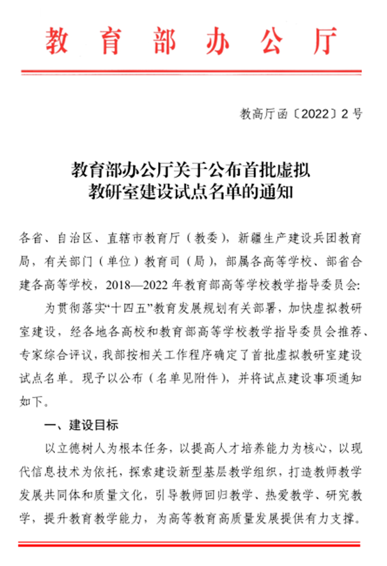 虛擬教研室是信息化時代新型基層教學組織建設的重要探索。為貫徹落實《教育部關于加快建設高水平本科教育全面提高人才培養能力的意見》和《教育部關于深化本科教育教學改革全面提高人才培養質量的意見》等文件精神,教育部高等教育司在2021年7月啟動了虛擬教研室試點建設推薦工作,旨在以立德樹人為根本任務,以提高人才培養能力為核心,以現代信息技術為依托,建設一批類型多樣、動態開放的虛擬教研室,建強基層教學組織,加強跨專業、跨校、跨地域教研交流與共建共享,引導教師回歸教學、熱愛教學、研究教學,為高等教育高質量發展提供有力支撐。