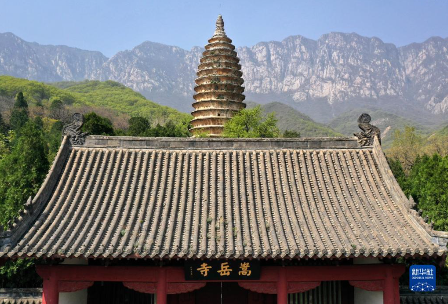 這是登封“天地之中”歷史建筑群中的嵩岳寺塔(4月7日攝,無人機照片)。