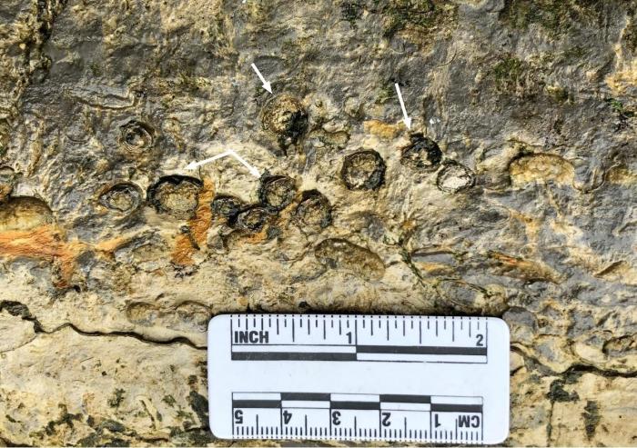 廣西百色市隆林縣野外發現的脊椎動物骨骼露頭,白色箭頭指示肋骨斷面?!№n鳳祿供圖