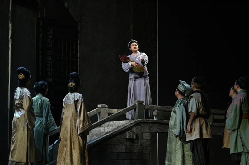 在歌劇院舞臺巨型幕布所呈現的杭州山水遠景圖下,在大運河的粼粼波光中,飽含中國韻味的抒情序曲如運河靜靜流出。隨后,國家大劇院合唱團員們化作象征著運河流水的“水靈”,以似河水般清澈柔美的音色,開始以千年長河的“擬人化”視角帶觀眾進入這一凄美感人的故事。