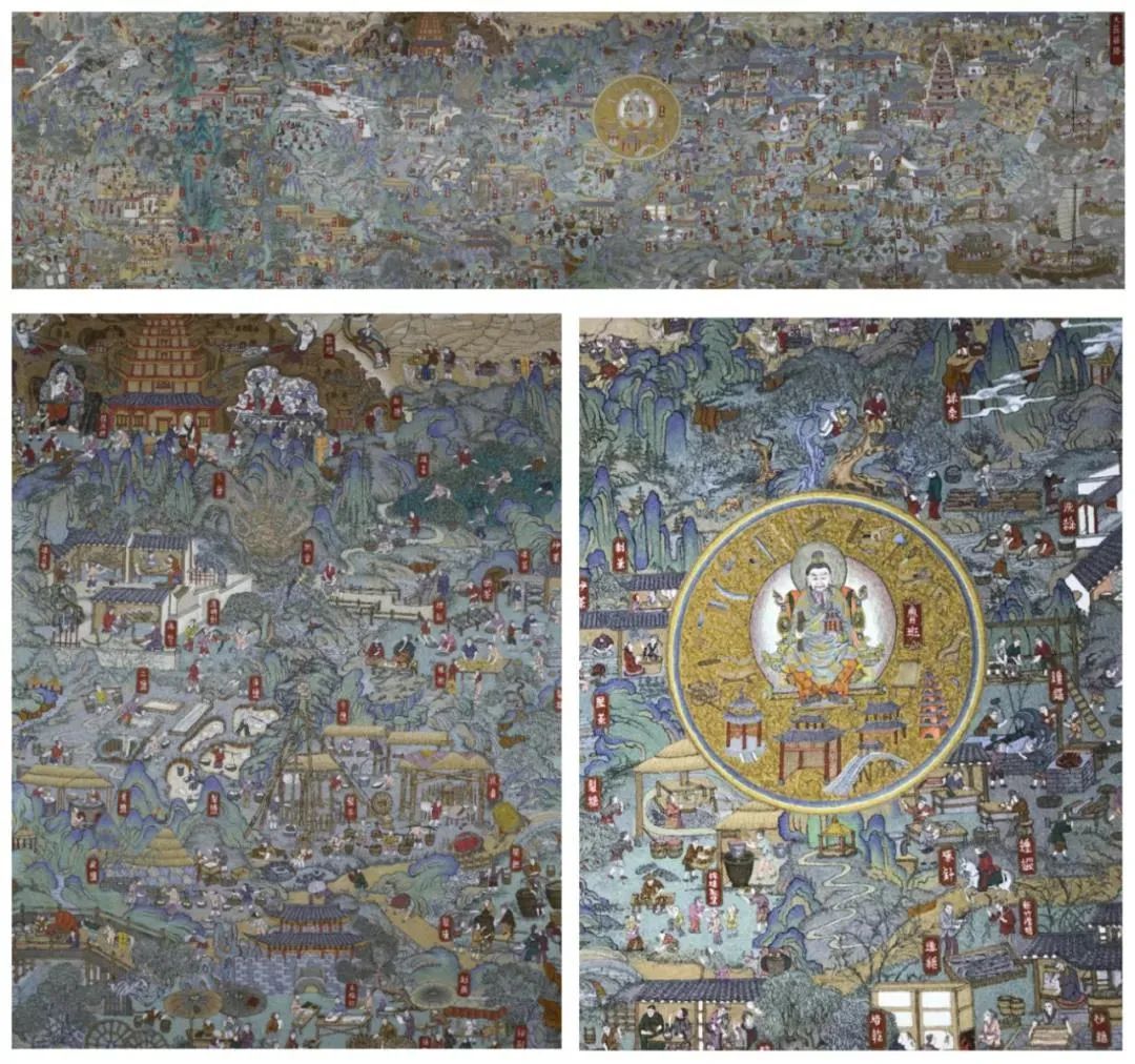 《大匠絲路》是我創作的一件手繡作品,畫面內容匯集了民間社會的百工匠作。在我的理解中,絲綢之路不僅是一條通商之路,還是中華民族傳統工藝傳播之路,是工匠造物文化發展的集中脈絡?!洞蠼辰z路》以絲路“百工匠作”為主題,運用長卷形式描繪了在南北絲綢之路上的傳統工匠技藝場景,其中包括手工藝制作、貿易通商及風俗文化的生活畫卷,同時描繪了海上絲綢之路上的采珠、貿易經商及造船工藝等,展現了人們在各種海上漕船、海舟等運輸工具上運載絲綢、陶瓷、香料的情景。該作品通過表現絲路大匠勞作的場面、技藝傳承、風俗習慣等諸多與工匠勞作有關的圖像,突出絲路百工匠作的傳播歷程,表現了絲綢之路上的傳統工藝發展與變遷。