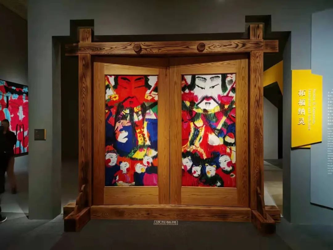 “到民間去”,在田野與鄉村,民眾為生活而創造的美的造物常常令人目不暇接。在這次展覽中,展廳形象墻上的門神年畫原稿,是我上世紀80年代從山東濰坊楊家埠收集到的。民間習俗農歷新年貼門神于門上,衛家宅、保平安、助功利、降吉祥,門神是民間祈福納祥情感愿望的表達?!伴T神”是本次展覽著意突出的文化符號,《拓福納靈》展示單元置放了一件《門神》裝置作品。這件作品為傳統木構門扇雙面鑲嵌門神織繡,它所傳遞的觀念是透過民藝之門,美化當代生活。門神裝置曾多次出現在我的展覽中,呈現形式不斷創作迭代。門扇上的門神畫像由最初的木版年畫替換為手繡圖像。楊家埠門神年畫呈現的是年畫的原真性之美,那么門神裝置則承載了“創造性轉化”的意圖,把傳統再次帶入了當代人的審美視野。