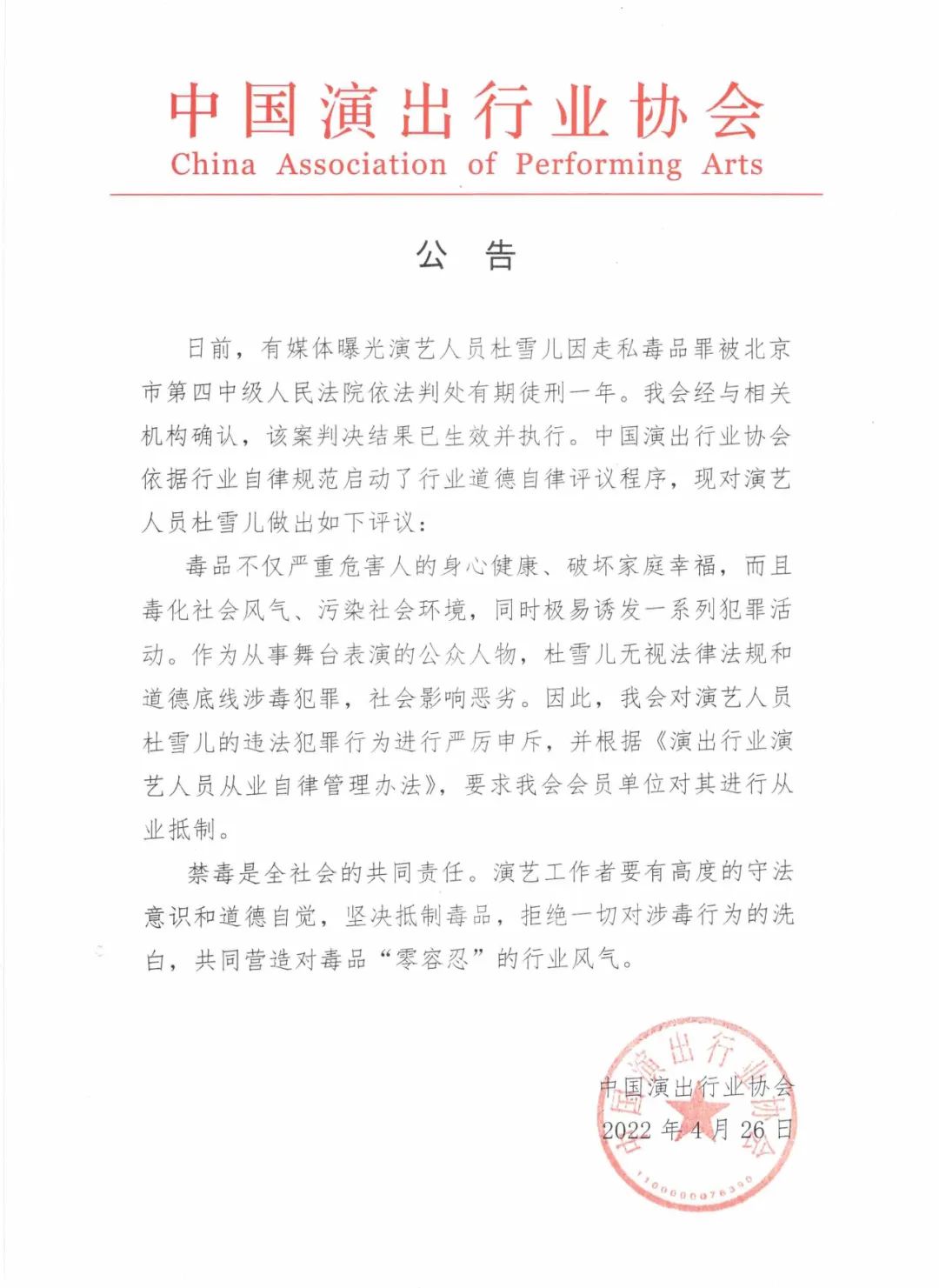 中國網北京4月26日訊 中國演出行業協會今日在其官方微信號發布《中國演出行業協會發布對杜雪兒進行從業抵制的公告》。
