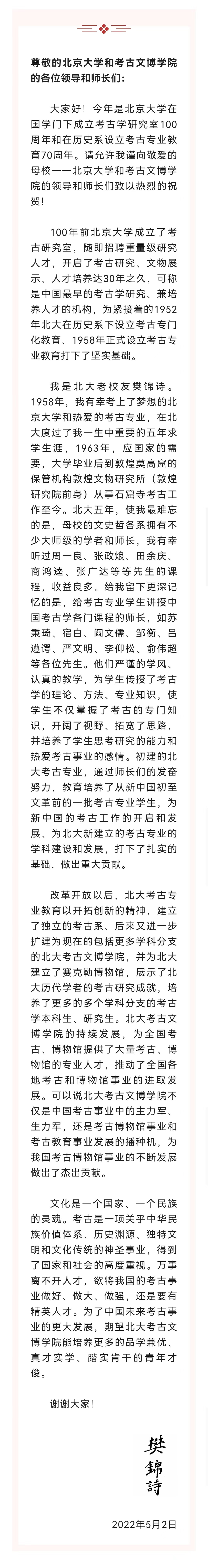 中國網5月6日訊 今年是北京大學成立考古學研究室100周年和在歷史系設立考古專業教育70周年。作為北大校友,敦煌研究院名譽院長、著名學者樊錦詩致信祝賀。以下為賀信全文: