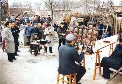 1986年,音樂學家喬建中帶領中國藝術研究院音樂研究所學者在河北省固安縣屈家營的音樂會現場采訪錄音。