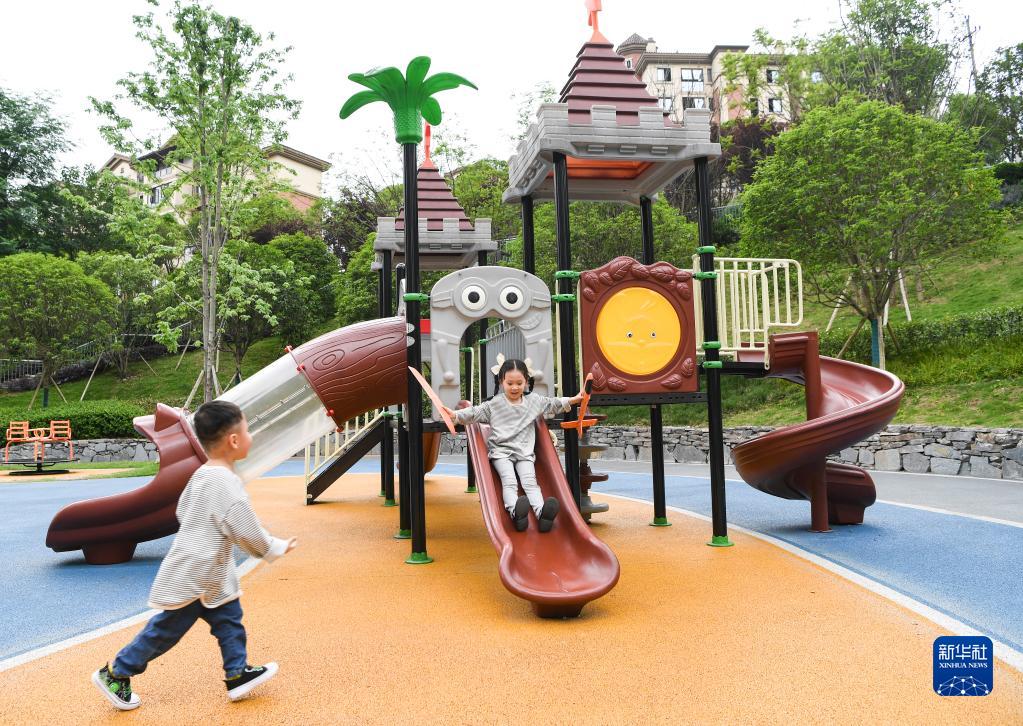 小朋友在重慶江北區石子山社區體育文化公園玩耍(4月29日攝)。