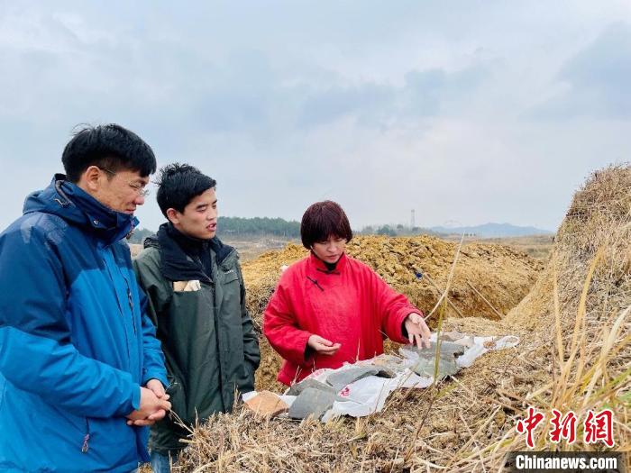 周必素(右一)對采集到的遺物和考古人員進行探討?!v 攝