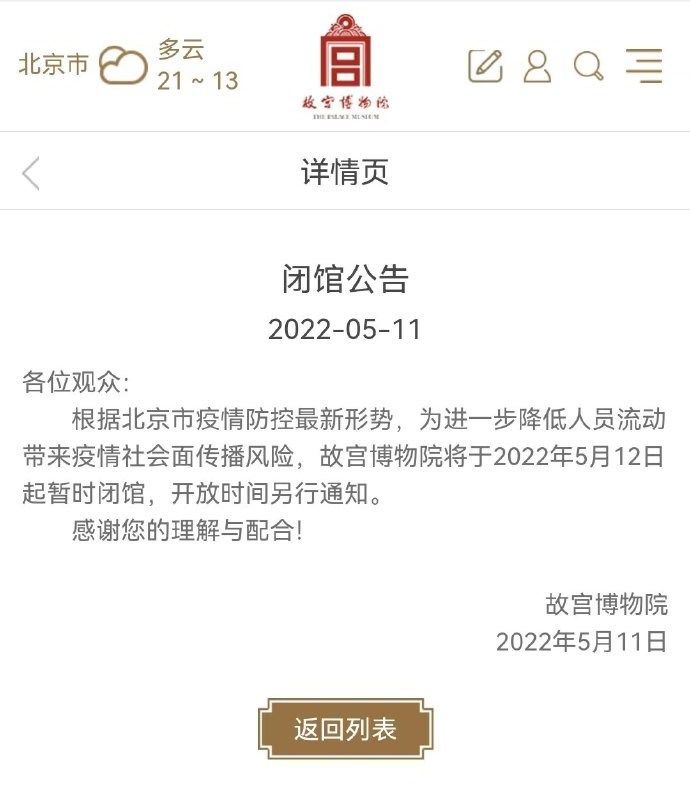 中國網北京5月11日訊 故宮博物院11日發布公告稱,根據北京市疫情防控最新形勢,為進一步降低人員流動帶來疫情社會面傳播風險,故宮博物院將于2022年5月12日起暫時閉館,開放時間另行通知。