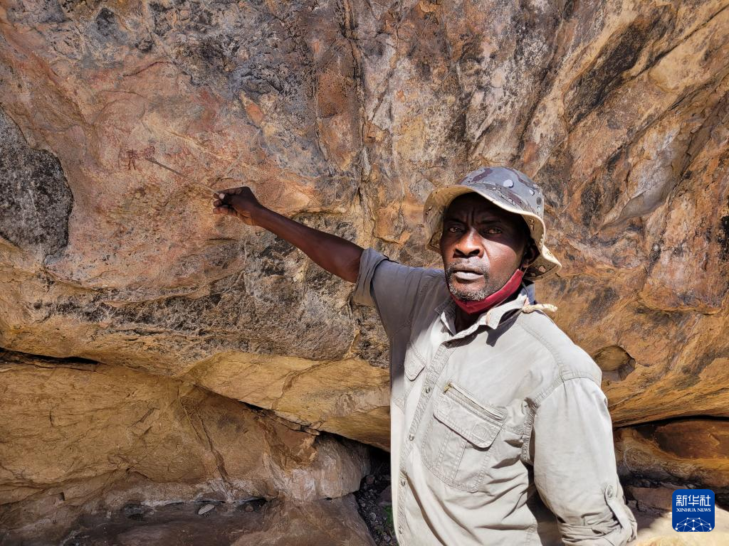 5月3日,在博茨瓦納圖利自然保護區內的莫哈巴能巖畫遺址,向導曼亞查向記者介紹巖畫。