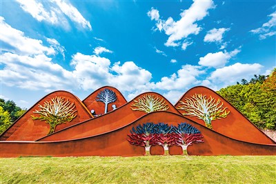 發展理念的藝術詮釋?!扒嗌骄G水是最大的本錢?!睒闼囟指挥谡芾淼脑捳Z表明,山青青、水盈盈,不僅是一種自然景觀,也是一種發展境界?;谶@樣的認識,雕塑家把作品做成綿延起伏的金色山巒,象征金山,并使之與周邊的大地、青山、綠水自然地融為一體,使藝術的山與現實的山交相輝映。同時,嵌入山中的七棵樹則象征青山,并淡化樹干樹枝樹葉的綠色,著重以光彩奪目的金色來顯示。作品把山水、雕塑、環境、觀念結合在一起,通過材料、造型、光影、色彩之間的交互作用,營造一種夢幻般的情境,直觀地反映了人與環境、環境與經濟的關系,詩意地表達出“綠水青山就是金山銀山”的理念。