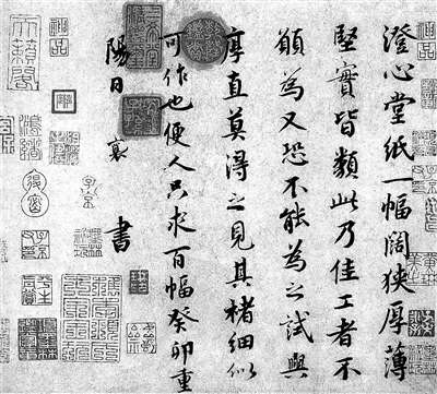 梅堯臣更是受寵若驚,他在給歐陽修的詩文中說:“江南李氏有國日,百金不許市一枚……君今轉遺重增愧,無君筆札無君才。心煩收拾乏匱櫝,日畏后兵扌奢裂防嬰孩。不忍揮毫徒有思,依依還起子山哀?!币馑颊f當年李煜還活著的時候,這紙就百金難求,現在價值更貴重了,你卻送我兩張。我沒有你那么有才,根本不舍得在這么昂貴的紙上寫詩作畫。不得不放在柜子里藏起來小心看護,每天還得防著家里小孩給我弄壞了。每次打算用的時候,拿起筆卻又舍不得,只好看著遠處的風景惆悵。