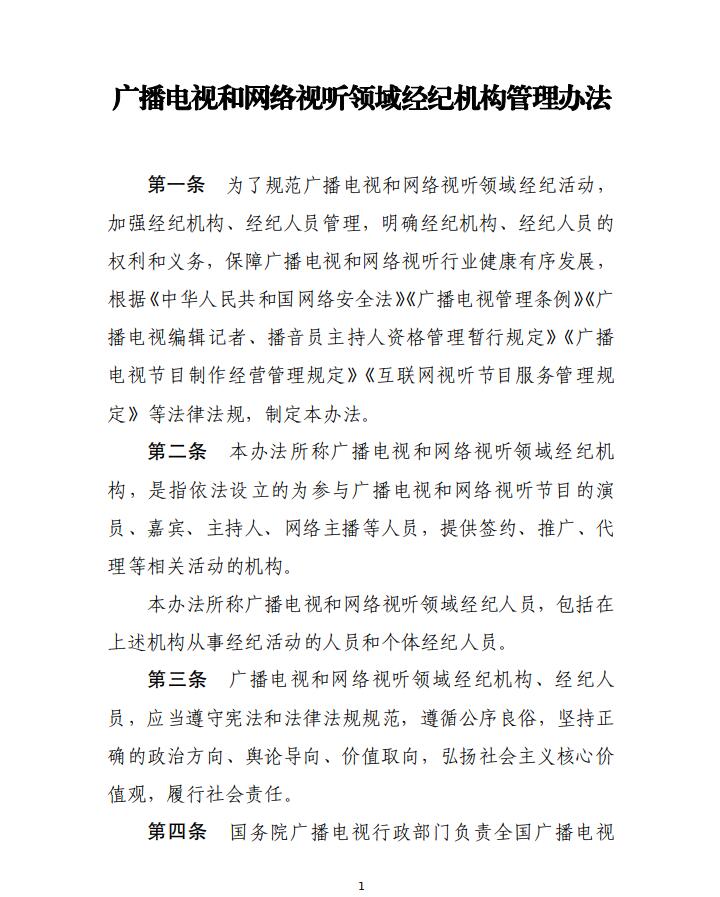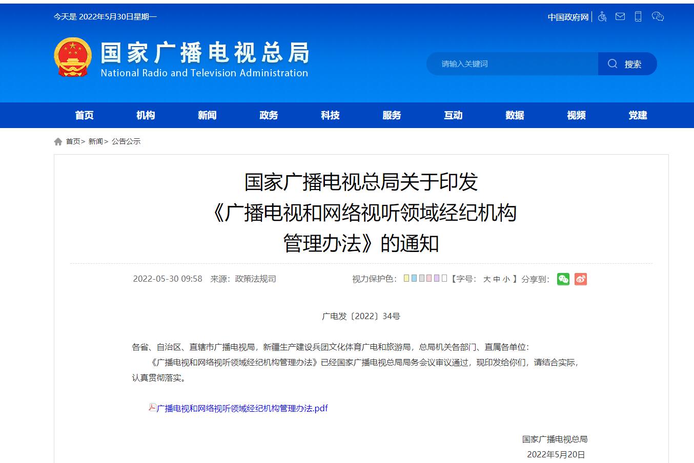 中國網北京5月30日訊 (記者 秦金月)5月30日,國家廣播電視總局印發《廣播電視和網絡視聽領域經紀機構管理辦法》(以下簡稱“《辦法》”)的通知。