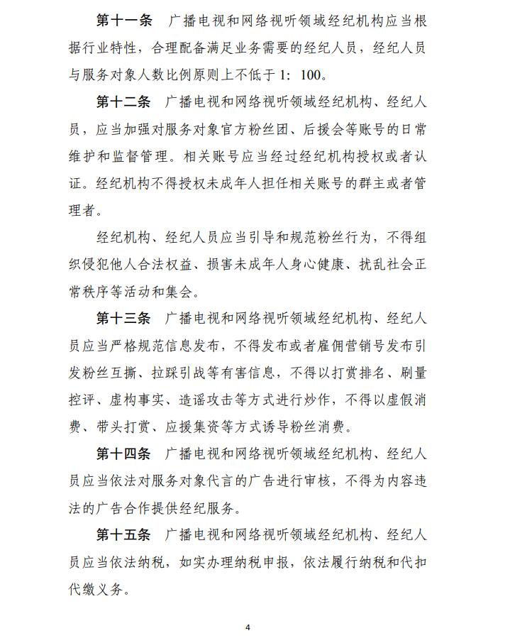 《辦法》指出,經紀機構、經紀人員應當嚴格規范信息發布,不得發布或者雇傭營銷號發布引發粉絲互撕、拉踩引戰等有害信息,不得以打賞排名、刷量控評、虛構事實、造謠攻擊等方式進行炒作,不得以虛假消費、帶頭打賞、應援集資等方式誘導粉絲消費。