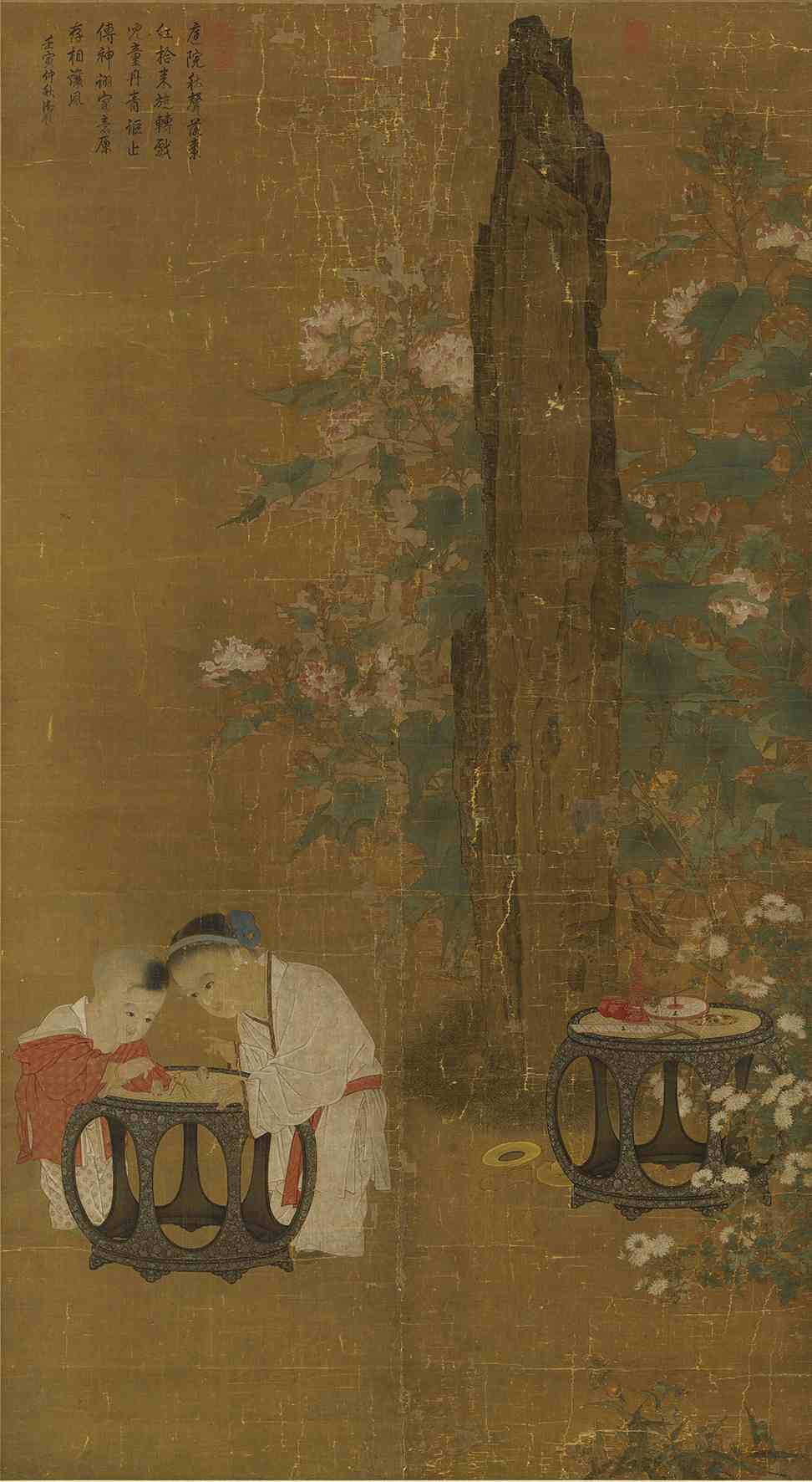 畫面背景中一通筆直的湖石巋然而立,周圍有芙蓉和雛菊陪襯,與前景中的姐弟游戲相比,顯得格外高大挺拔。在高約2米的大畫幅中,這樣的構圖一方面強調了前景中孩子們身形的嬌小,點明了“嬰戲”的主題;另一方面又借用了北宋時期“頂天立地”的山水畫法,用湖石撐起畫面整體上“豐亨豫大”的美學氣度,將嬰戲圖這種“小畫題”的作品處理成如山水畫一樣具有“紀念碑式”精神意義的鴻篇巨制,通過大與小、疏與密、概括與精描的對比,使畫面顯得張弛有度、繁簡分明,既有可以“遠望”的花石,又有可以“近觀”的嬰戲,形成一種帶有劇場感的視覺張力,創造了嬰戲圖“小題大做”的典范。