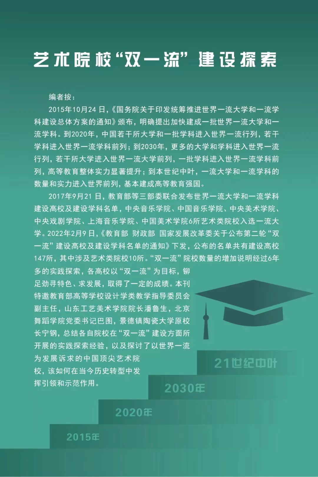 建設世界一流大學和一流學科(“雙一流”)作為新時代高等教育強國建設的引領性和標志性工程,已進入首輪結束而第二輪開始實施的新階段。自2015年10月24日,《國務院關于印發統籌推進世界一流大學和一流學科建設總體方案的通知》(國發〔2015〕64號)發布揭開了“雙一流”建設的序幕開始,到2022年2月9日《教育部財政部國家發展改革委關于公布第二輪“雙一流”建設高校及建設學科名單的通知》(教研函〔2022〕1號)發布,“雙一流”建設已推進實施6年有余。當前,“雙一流”建設面臨大有可為的戰略機遇,如何堅守中國特色,融入發展大局,充分發揮自身優勢,在相關學科領域躋身世界一流,是“雙一流”建設面臨的首要任務。山東工藝美術學院設計學學科全面深化認識,在新政策指引下,“著力解決‘雙一流’建設中仍然存在的高層次創新人才供給能力不足、服務國家戰略需求不夠精準、資源配置亟待優化等問題”①,將設計學學科建設不斷推向前進。
