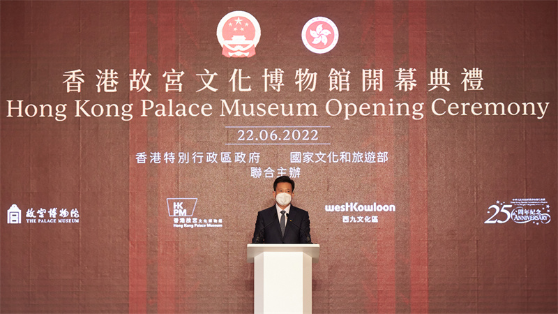 李群向香港特區政府表示祝賀。他說,習近平主席十分關心香港文化藝術發展,2017年6月親自見證簽署《興建香港故宮文化博物館合作協議》。香港故宮文化博物館的建設,是故宮所代表的中華優秀傳統文化與現代化、國際化香港之間的創造性結合,是內地與香港文化文物合作的里程碑事件,是香港與內地共享中華優秀傳統文化、賡續傳承中華文明的創新性實踐。香港故宮文化博物館的建成,讓香港市民能夠零距離欣賞美輪美奐的珍貴文物,體悟中華優秀傳統文化的厚重底蘊,增強香港繁榮昌盛的文化自信。他表示,文化和旅游部、國家文物局將在中央政府的堅強領導下,與香港特區政府加強合作,進一步深化內地與香港的文化、文物、旅游交流,推動香港文化發展更好融入中華文化繁榮,為擴大中華文化國際影響力、推動人類文明交流互鑒作出新時代的香港貢獻。