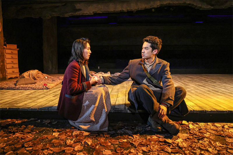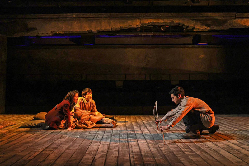 除了作品本身的吸引力,該劇的舞臺呈現也給人身臨其境的感覺。包裹式的舞臺,觀眾在舞臺兩側對面而坐,既可以看到舞臺上的演員,也能看到對面的觀眾,再加上演出過程中真實環繞的爆炸聲、舞臺上方傾瀉而下的流沙,打入觀眾席的斑駁樹影……導演林叢介紹稱這樣的舞臺既唯美又讓觀眾有更強的代入感?!拔覀兿朐谖枧_環境中,埋下詩意的種子”,同時這樣的呈現也更符合生活場景,“我希望觀眾能夠靜靜地坐在那里,就像跟我們一起生活在這里,臺上人的困惑與選擇就是我們自己的?!?/p>