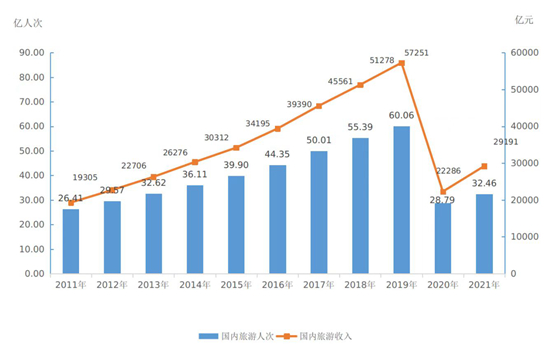2011-2021年國內旅游發展情況。截圖來源:文化和旅游部2021年文化和旅游發展統計公報。