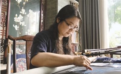 午后斑駁的陽光,從繃架上透明的黑色絹紗縫中漏下來,讓一縷縷絲線閃動著光……陳英華將細如發絲的藍線,分出1/16,穿過繡花針,先在刺繡面料上繡一個小點固定絲線,然后選定附近一點,從上到下刺過絹紗,留下一道線痕,再尋合適位置,從下往上刺,續上下一段弧線。一段緊接一段,眨眼工夫,就勾勒出星空邊緣的一角。