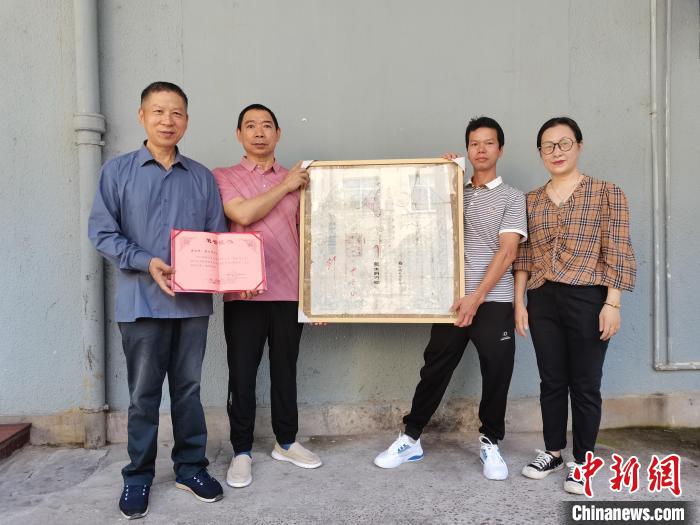船政后裔黃達輝(右二)和黃水平(左二)共同捐贈中法馬江海戰功牌?!≈袊幕┪镳^供圖