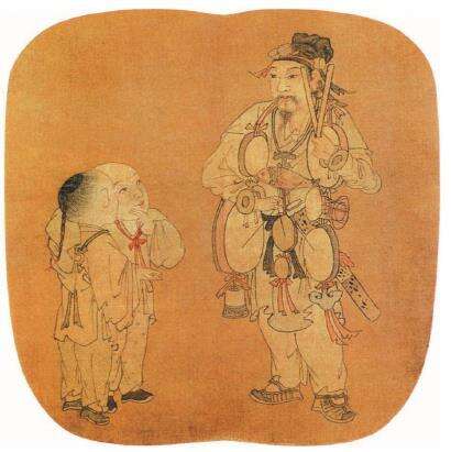 臺北故宮博物院藏北宋蘇漢臣《雜技戲孩圖冊》中,可見一老藝人身上掛著幾種樂器
