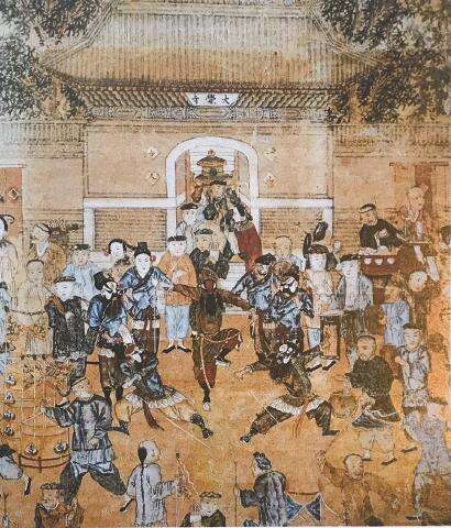 清代《妙峰山廟會圖》中有走會場面,數人扮成京劇人物表演武打動作,旁有若干伴奏者