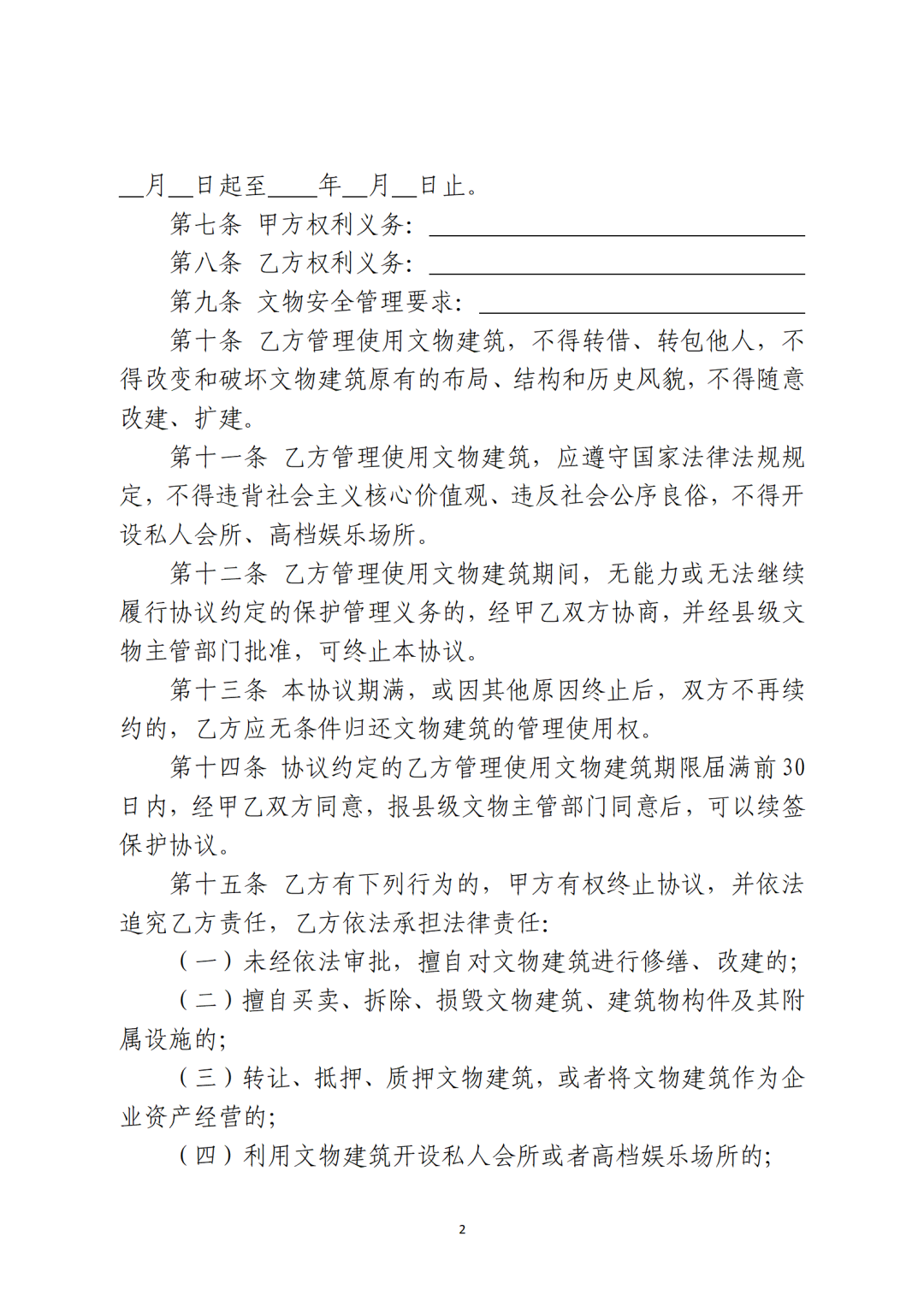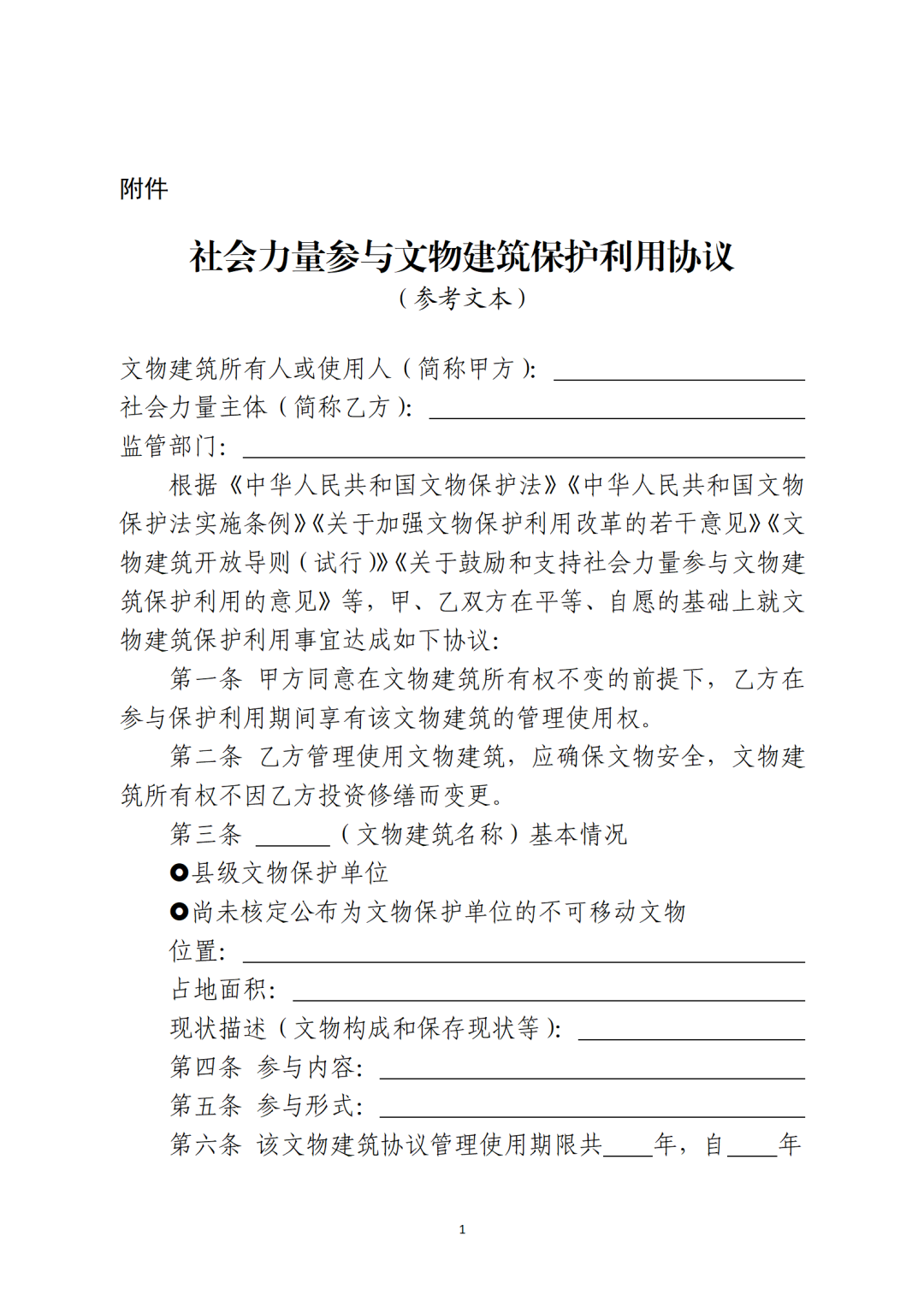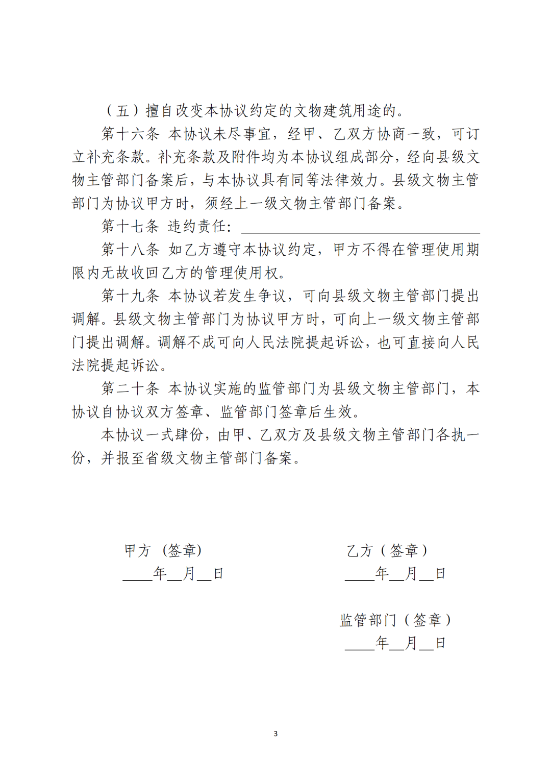 六、簽訂協議。省級文物主管部門可參照社會力量參與文物建筑保護利用協議參考文本(附后),結合本地實際,制定社會力量參與文物建筑保護利用協議文本。按照“一處一策”原則,文物建筑所有人或使用人與確定的社會力量主體簽訂保護利用協議,明確保護利用要求、各方權利義務和違約責任等內容。沒有明確使用人的國有文物建筑可由縣級文物主管部門與社會力量主體簽訂保護利用協議。協議簽訂后,應報至省級文物主管部門備案。