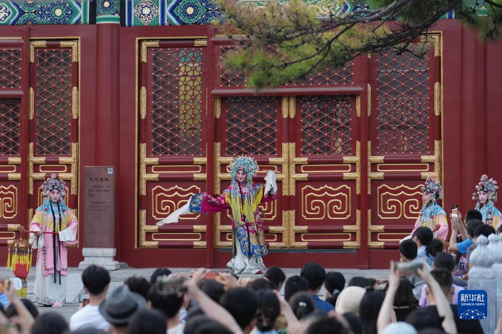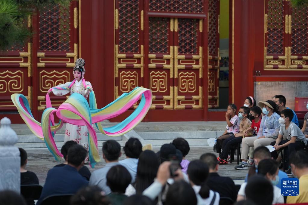 7月30日,市民游客在欣賞國家京劇院演員表演京劇《天女散花》。