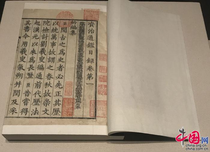 圖為展出的精品古籍《資治通鑒二百九十四卷目錄三十卷》。趙萬里主編《中國版刻圖錄》對此本曾評價:“宋時建本、鄂本、蜀本都直接間接從此本出。此書元豐監本久佚,此為碩果僅存之第一本”。 攝影 中國網記者 蘇向東