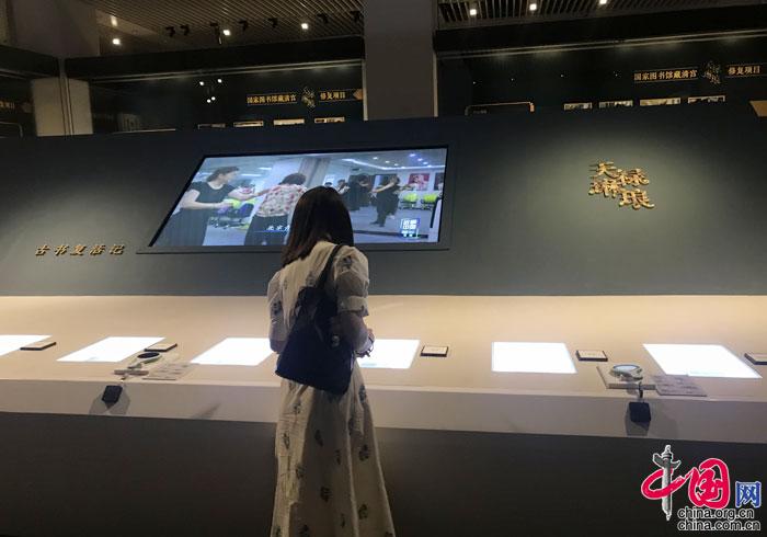 展廳設置了古籍修復場景復原、修復紙樣體驗等互動項目。在古籍修復室的復原場景區,觀眾可以用數字化的方式體驗“天祿琳瑯”修復項目的各種修復形式,一起參與守護“天祿琳瑯”藏書,在完成闖關后,觀眾將成為“天祿琳瑯”守護人,獲得一張電子版“天祿琳瑯”守護人證書。而在“修復紙樣體驗”中,觀眾可對不同種類的修復用紙進行“科學”檢測,通過指定操作可得到一份包括紙張產地、制作工藝、纖維結構等詳細信息的紙張報告,增進觀眾對古籍修復用紙的了解。