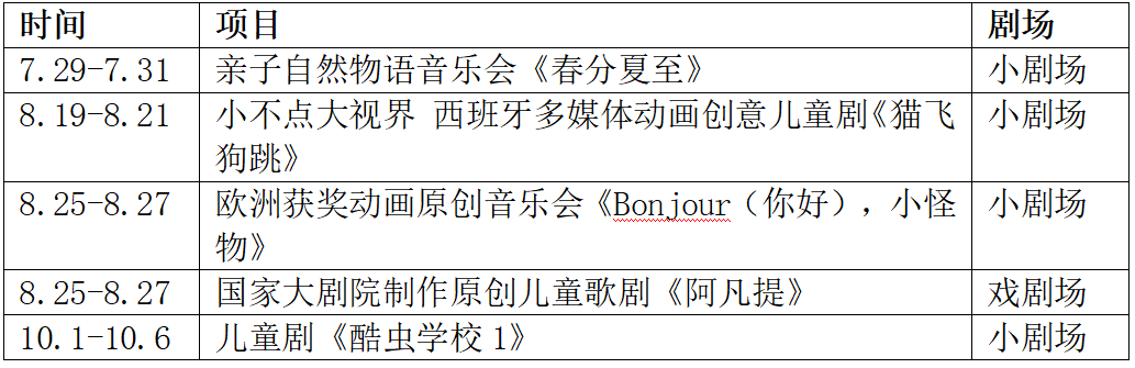 此外,2022國家大劇院兒童戲劇季也將在7月29日至10月6日,為小觀眾們帶來5臺24場多彩兒童劇目。國家大劇院原創兒童歌劇《阿凡提》、自然物語音樂會《春分夏至》、西班牙多媒體動畫創意兒童劇《貓飛狗跳》、歐洲獲獎動畫原創音樂會《Bonjour(你好),小怪物》及兒童劇《酷蟲學校1》,開啟夏日兒童戲劇生活新體驗。